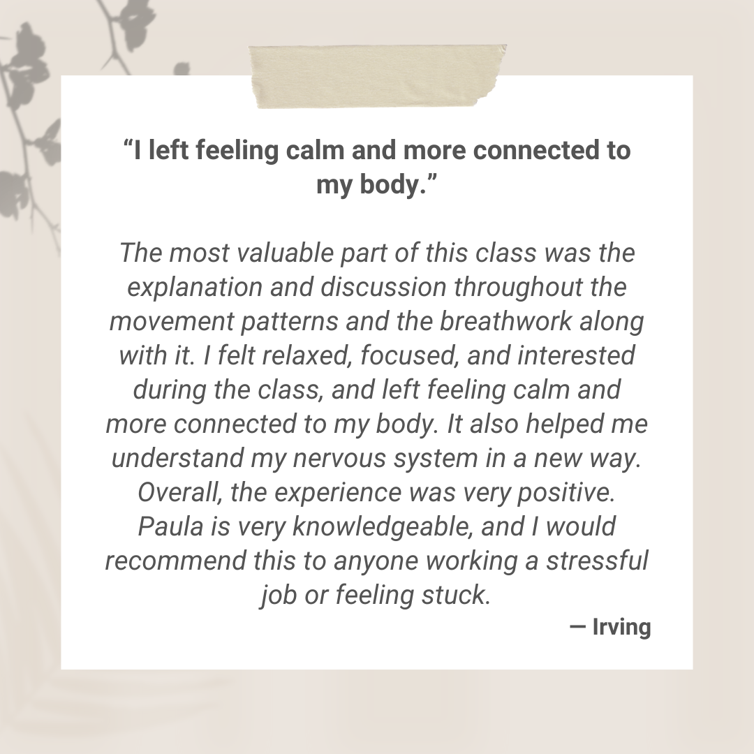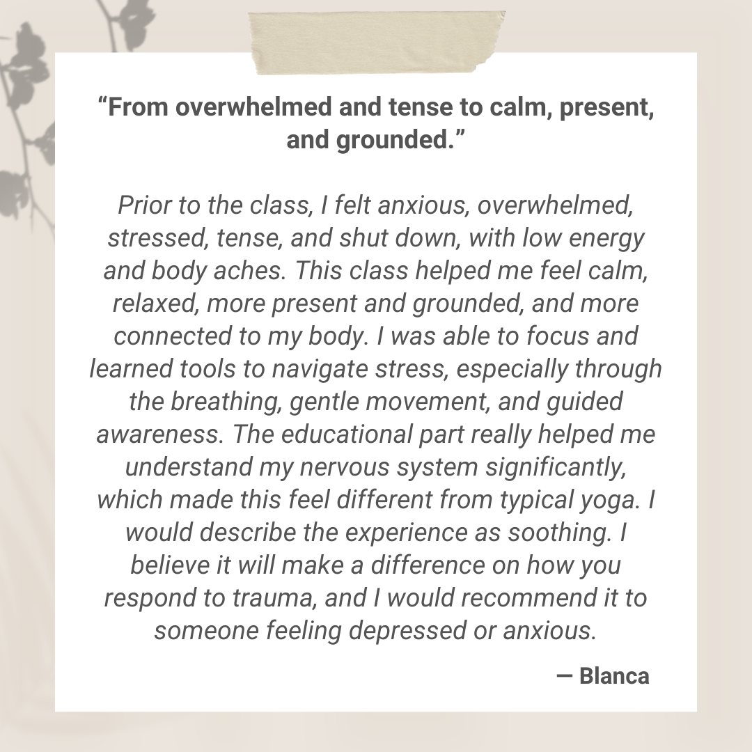 My intention is to create a space that supports learning, healing, and nervous system awareness. If it turns out this class is not the right fit for you at this moment, I fully honor that.